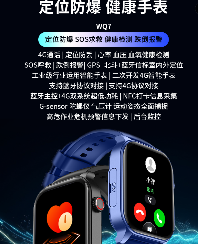 WQ7支持心率、血氧、血压、体温、血糖、尿酸、血脂、HRV、呼吸率等健康监测,支持4G通话和蓝牙BLE、支持精准室外北斗定位+室内蓝牙信标定位 ,带本安防爆认证。